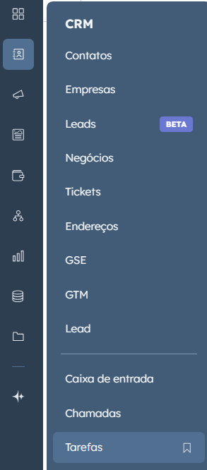 Você pode usar o HubSpot para criar e gerenciar tarefas, mantendo o controle de suas atividades. As tarefas podem ser usadas como lembretes associados a registros específicos. Clique em "CRM" e depois "Tarefas"