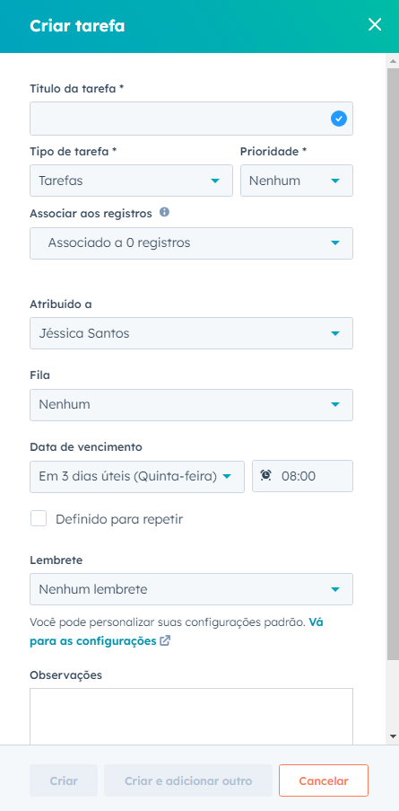 - Associar com Registros: Escolha os registros (como contatos, empresas, negócios) que serão associados à tarefa.