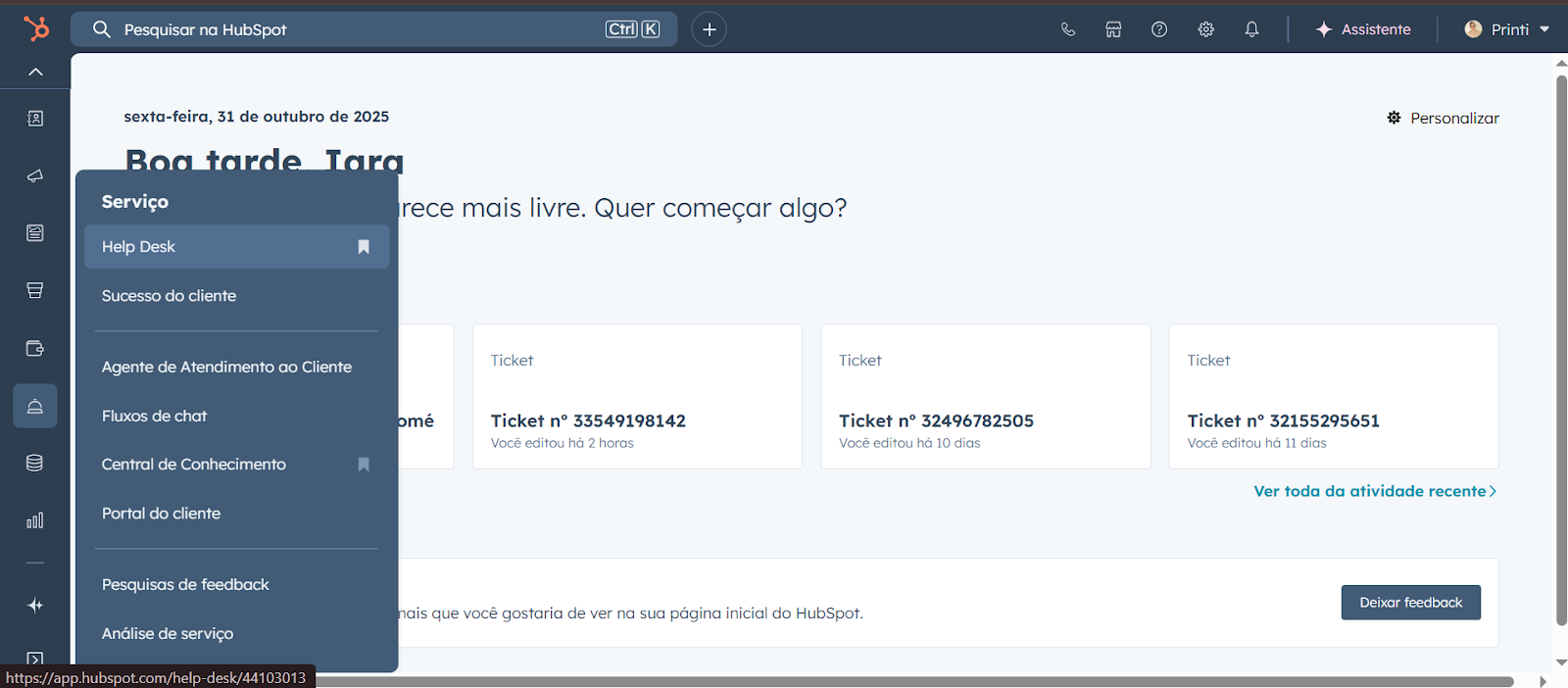 Selecione a opção "Serviço" assim encontrará a opção de HelpDesk: