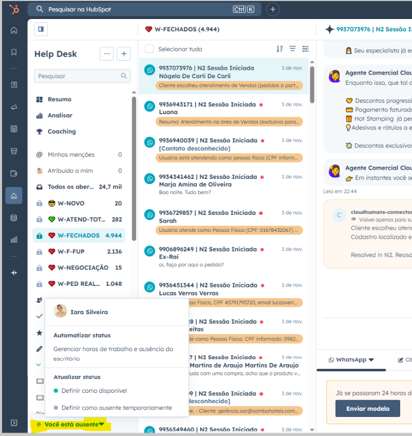 Na barra lateral esquerda, você irá encontrar os filtros de conversas e ao final da página, a opção de ficar ausente ou disponível na Fila.