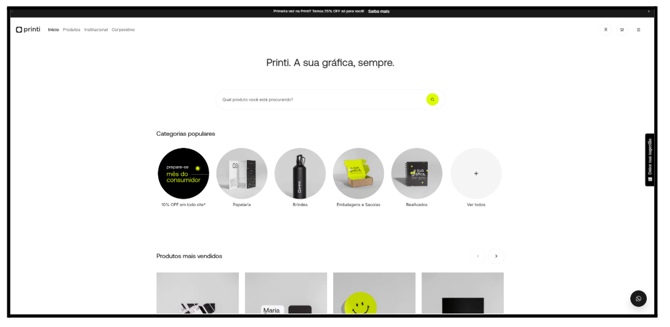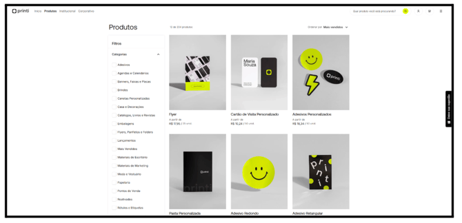 A Printi busca simplificar a jornada de compra, oferecendo uma experiência fluida e eficiente, desde a escolha do produto até a entrega. O layout é responsivo, o que também facilita a navegação em dispositivos móveis.