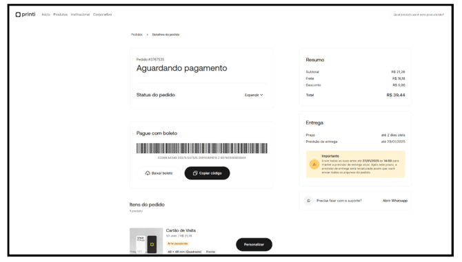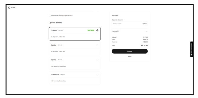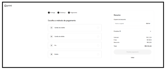 - Finalização de compra: Ao ir para o checkout, a Printi facilita o preenchimento dos dados necessários para a entrega. O site oferece opções de pagamento variadas (cartão de crédito, boleto, etc.) e garante a segurança durante o processo.